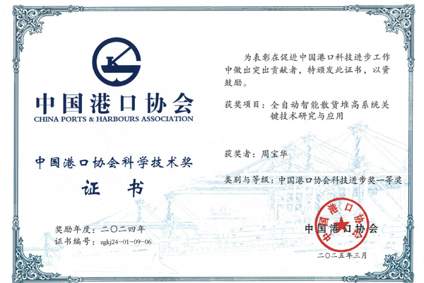 熱烈祝賀我公司“移動式堆料裝船一體機”榮獲中國港口協(xié)會科技進步獎一等獎